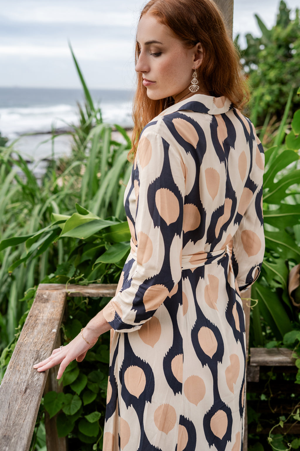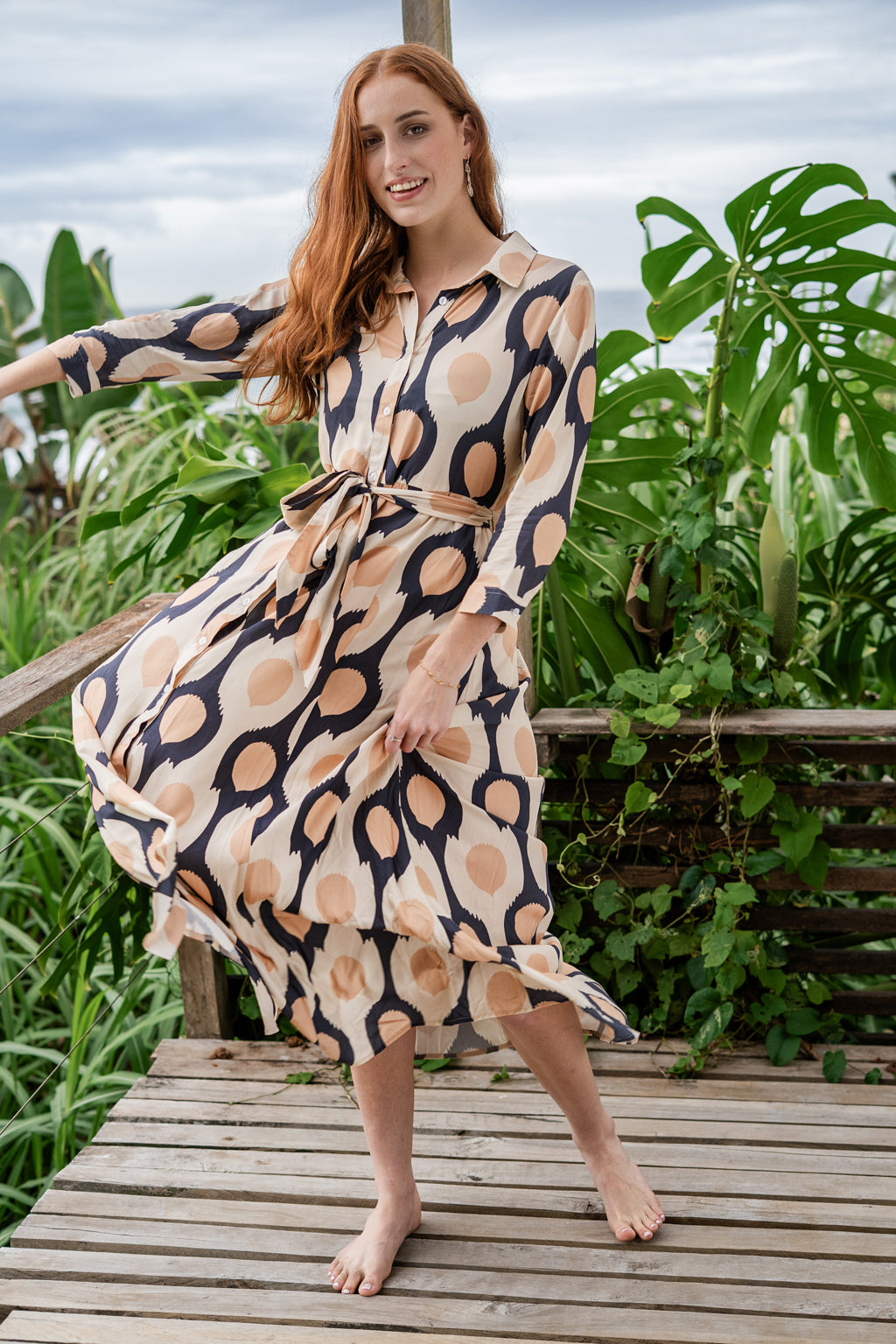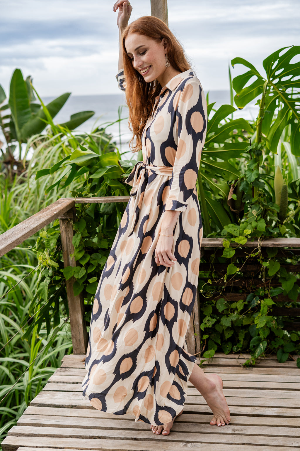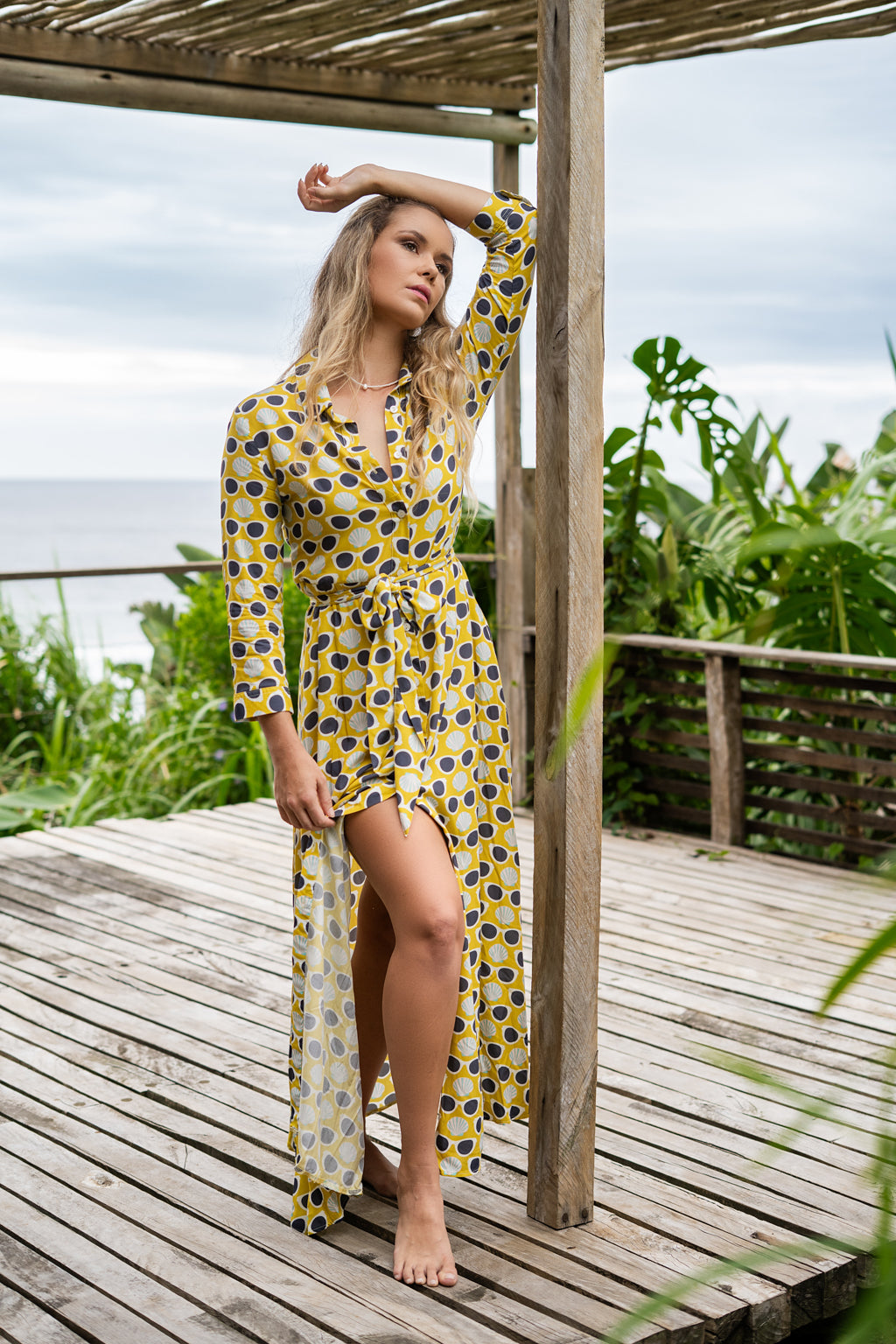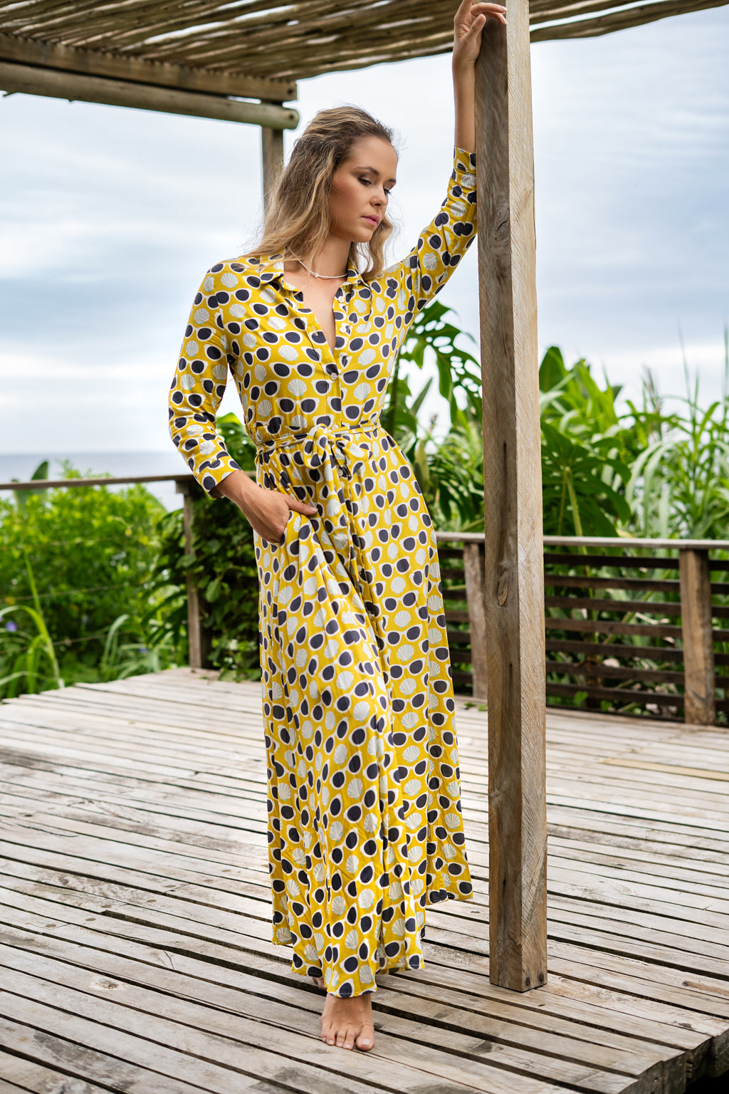 This is the ultimate day-night dress. A SLIM FIT maxi button down pocketed shirt dress, with a gorgeous semi fitted silhouette, featuring a removable tie sash and mid-length, cuffed sleeve. She will cross over from work to play or visa versa, and rise to any occasion!